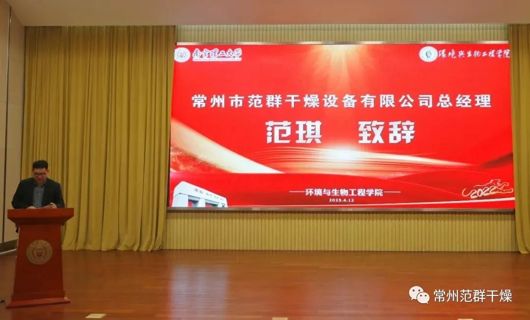 4月12日下午, 南京理工大學(xué)環(huán)生學(xué)院環(huán)境與生物工程學(xué)院舉行2022年度社會(huì)獎(jiǎng)學(xué)金頒獎(jiǎng)典禮暨優(yōu)秀學(xué)生報(bào)告會(huì)。南京理工大學(xué)博士研究生、常州市范群干燥設(shè)備有限公司總經(jīng)理、江蘇南理范群裝備科技有限公司總經(jīng)理范琪博士應(yīng)邀出席并作為企業(yè)代表發(fā)言。
