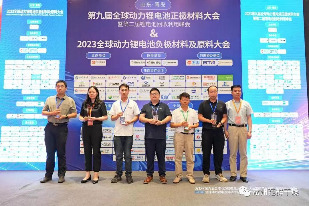 2023 年7月 6-7日,旺材鋰電在青島舉辦了“2023第九屆全球動力鋰電池正極材料大會暨第二屆鋰電池回收利用峰會”,常州范群獲得旺材鋰電“金翎獎”優(yōu)質(zhì)供應(yīng)商企業(yè)。