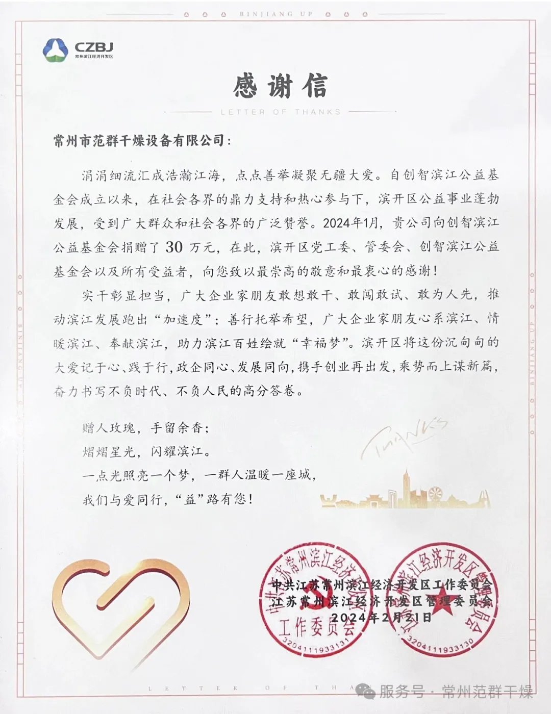 近日,常州市范群干燥設(shè)備有限公司向創(chuàng)智濱江公益基金會捐贈30萬元,以實際行動支持濱開區(qū)公益事業(yè)發(fā)展,用愛心善舉踐行企業(yè)社會責(zé)任,為區(qū)域公益事業(yè)注入溫暖力量。