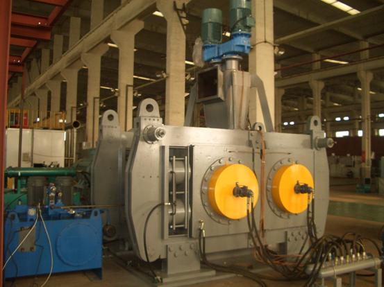該對輥式壓片造粒機(jī)由機(jī)架組件,壓輥組件,傳動裝置,液壓緩沖組件及喂料機(jī)五部分組成.其工作原理為: 該機(jī)利用成對壓輥,彼此留有一定間隙,采用同步控制器控制兩臺電機(jī)和減速機(jī),使對輥同步且相向運轉(zhuǎn)。其中一組對輥軸座固定,另一組對輥軸座滑動,藉助液壓缸施壓彼此緊靠,同時液壓系統(tǒng)還起補償作用。壓輥表面有規(guī)則地排列許多形狀、大小相同的穴孔(弧槽),根據(jù)物料對象壓縮比的不同,選擇采用一壓輥穴孔的波谷正好對準(zhǔn)另一壓輥的波谷或波峰對準(zhǔn)波谷。兩壓輥呈水平布置,粉粒狀物料從兩壓輥上方連續(xù)、均勻地靠自重及擠壓絞龍強制喂入兩壓輥之間,當(dāng)物料進(jìn)入咬入?yún)^(qū)后逐漸被壓輥咬入,隨著壓輥的連續(xù)旋轉(zhuǎn),物料占有的空間逐漸減少而被逐步壓縮,并達(dá)到成型壓力的最大值,隨后,則壓力逐漸降低,所壓得之壓片,因彈性回復(fù)加其壓片自重而脫落壓輥弧槽,接下來進(jìn)入切碎、整粒裝置并篩分至粒狀產(chǎn)品。