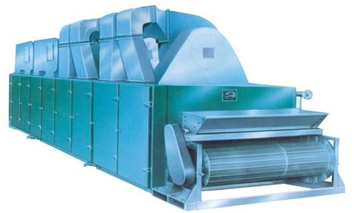 物料由加料器均勻地鋪在網(wǎng)帶上,網(wǎng)帶一般采用12-60目不銹鋼絲網(wǎng),由傳動裝置拖動在干燥機(jī)內(nèi)移動。干燥機(jī)由若干單元組成,每一單元熱風(fēng)獨(dú)立循環(huán),部分尾氣由專門排濕風(fēng)機(jī)排出,廢氣由調(diào)節(jié)閥控制,熱氣由下往上或由上往下穿過鋪滿物料的網(wǎng)帶完成熱量與質(zhì)量傳遞的進(jìn)程,帶走物料水份。網(wǎng)帶緩慢移動,運(yùn)行速度可根據(jù)物料溫度自由調(diào)節(jié),干燥后的成品連續(xù)落入收料器中。上下循環(huán)單元根據(jù)用戶需要可靈活配備,單元數(shù)量亦可根據(jù)需要選取。
