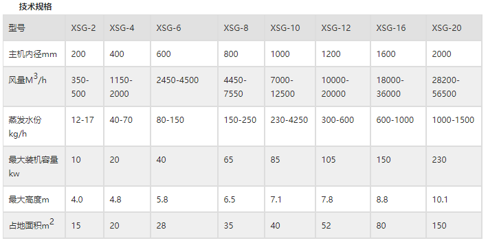 注:1.水分蒸發(fā)量是以進風溫度為1 80oC,出風溫度為80oC 時每小時蒸發(fā)的水份,
