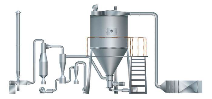 空氣經(jīng)過濾和加熱,進(jìn)入干燥器頂部空氣分配器,熱空氣呈螺旋狀均勻地進(jìn)入干燥室。料液經(jīng)塔體頂部的高速離心霧化器,(旋轉(zhuǎn))噴霧成極細(xì)微的霧狀液珠,與熱空氣并流接觸在極短的時(shí)間內(nèi)可干燥為成品。成品連續(xù)地由干燥塔底部和旋風(fēng)分離器中輸出,廢氣由風(fēng)機(jī)排空。