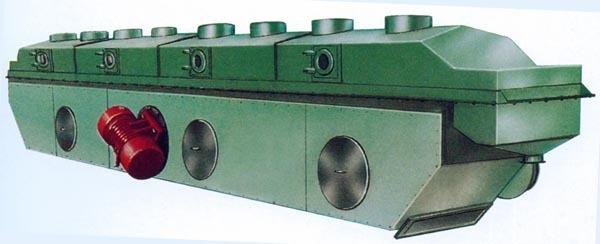 物料自進(jìn)料口進(jìn)入機(jī)內(nèi),在振動(dòng)力作用下,物料沿水平方向拋擲向前連續(xù)運(yùn)動(dòng),熱風(fēng)向上穿過流化床同濕物料換熱后,濕空氣經(jīng)旋風(fēng)分離器除塵后由排風(fēng)口排出;干燥物料由排料口排出。